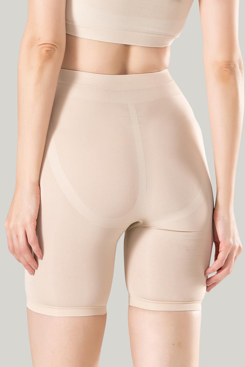 Hem günlük kullanım hem de elbise altı için ideal olan bu uzun paçalı ten şort, diz üstüne kadar inen formu ile sürtünmeye karşı koruma sağlar.